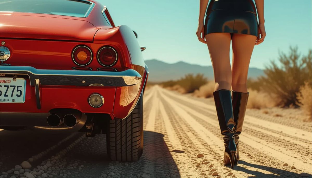A vibrant close-up showing the back of a classic sports car parked on a deserted road. The image features realistic reflections and natural light, with a woman's legs adding intrigue. The art style evokes vintage photography.
