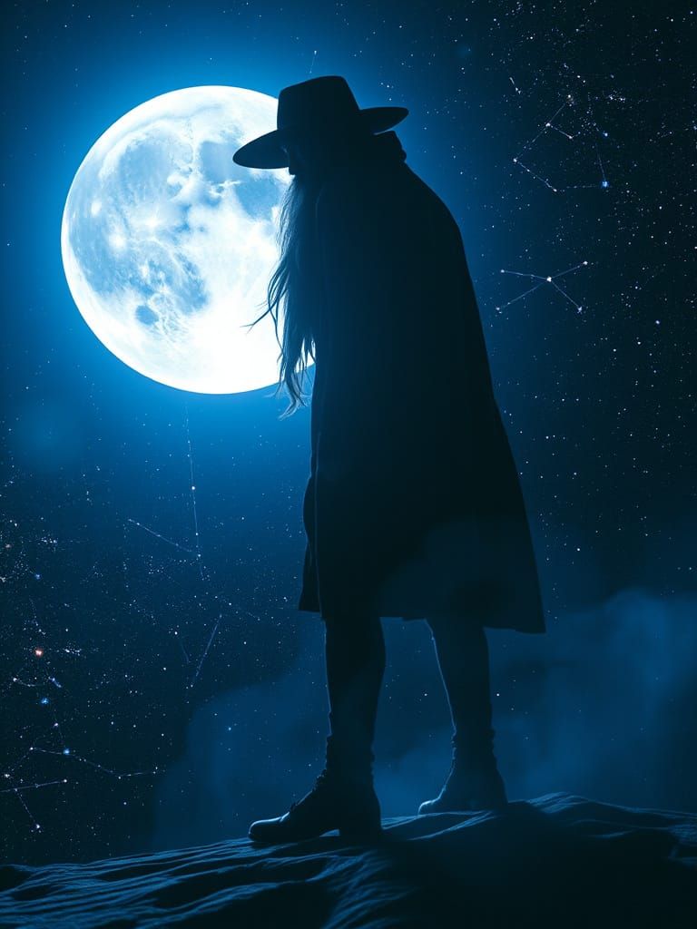 This image shows a tall, cloaked, wise old sandman in silhouette against a double exposure galaxy backdrop. The fantasy concept art features blue moonlight, constellations and glitter in high resolution.
