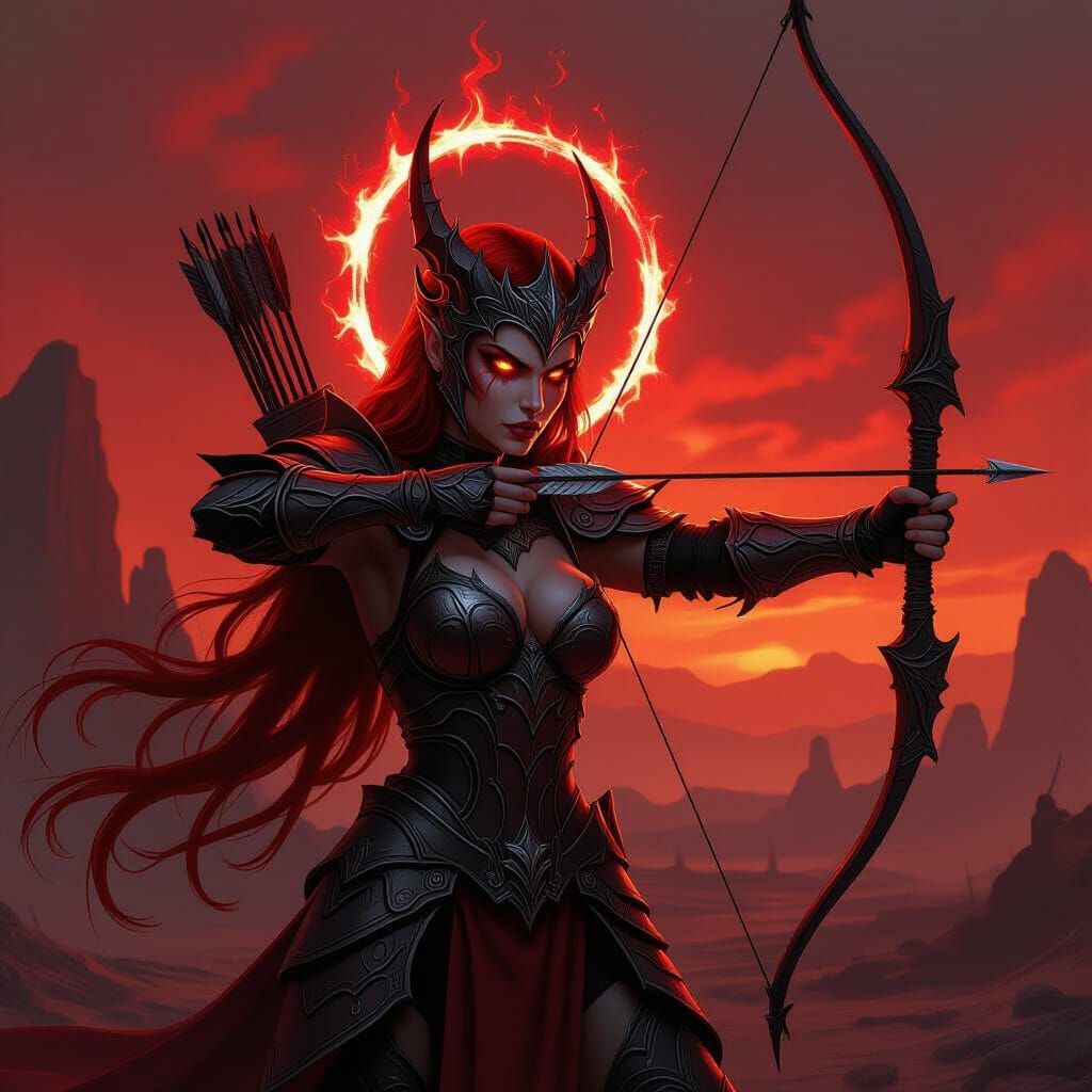 Easily generate unique images of armored dragon women archers with demonic eyes and glowing halos. Free and fast AI generation.