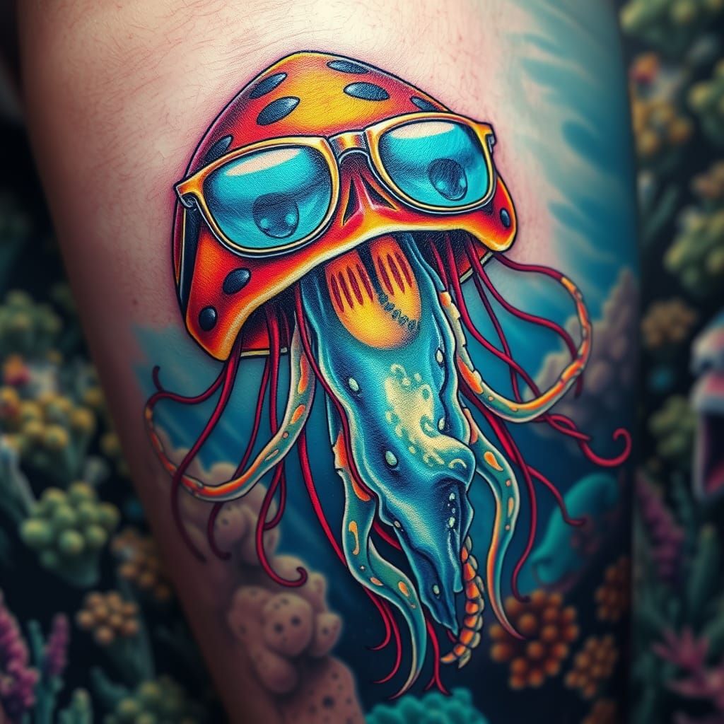 A vibrant tattoo of a jellyfish wearing sunglasses in a coral reef. The bioluminescent ink glows with intricate tribal designs and vivid colors, rendered with sharp focus and high contrast.
