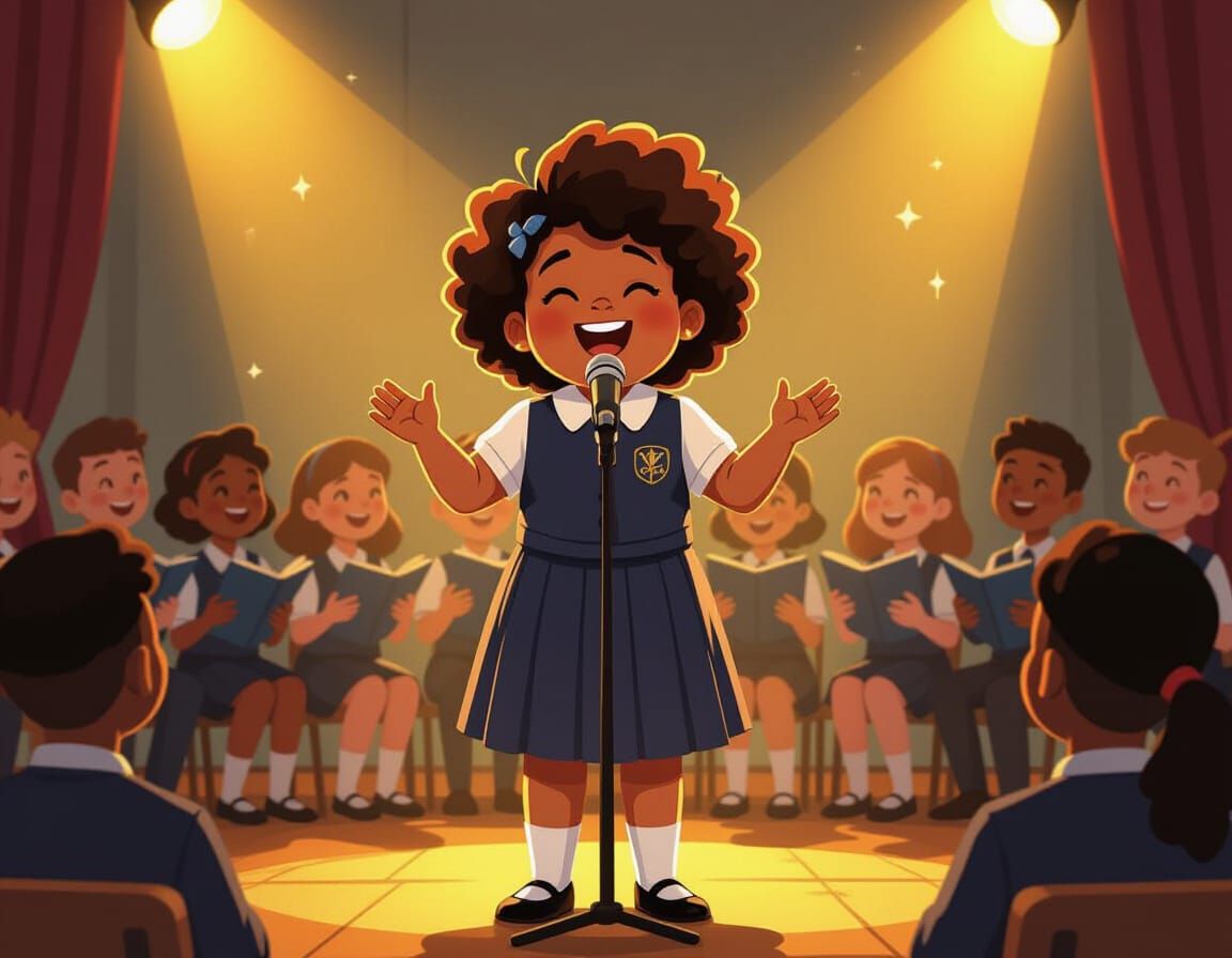 A beaming Black girl confidently sings a solo on stage during morning assembly. The image features high contrast, vibrant colors, and intricate detail, rendered in an oil gouache style.