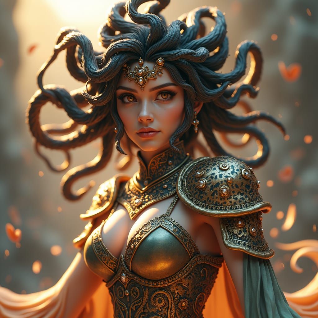 A 3D anime art piece of Medusa in a dynamic combat pose. Her serpentine hair writhes around her as she wears Greek-inspired armor, rendered in exquisite detail as digital art.