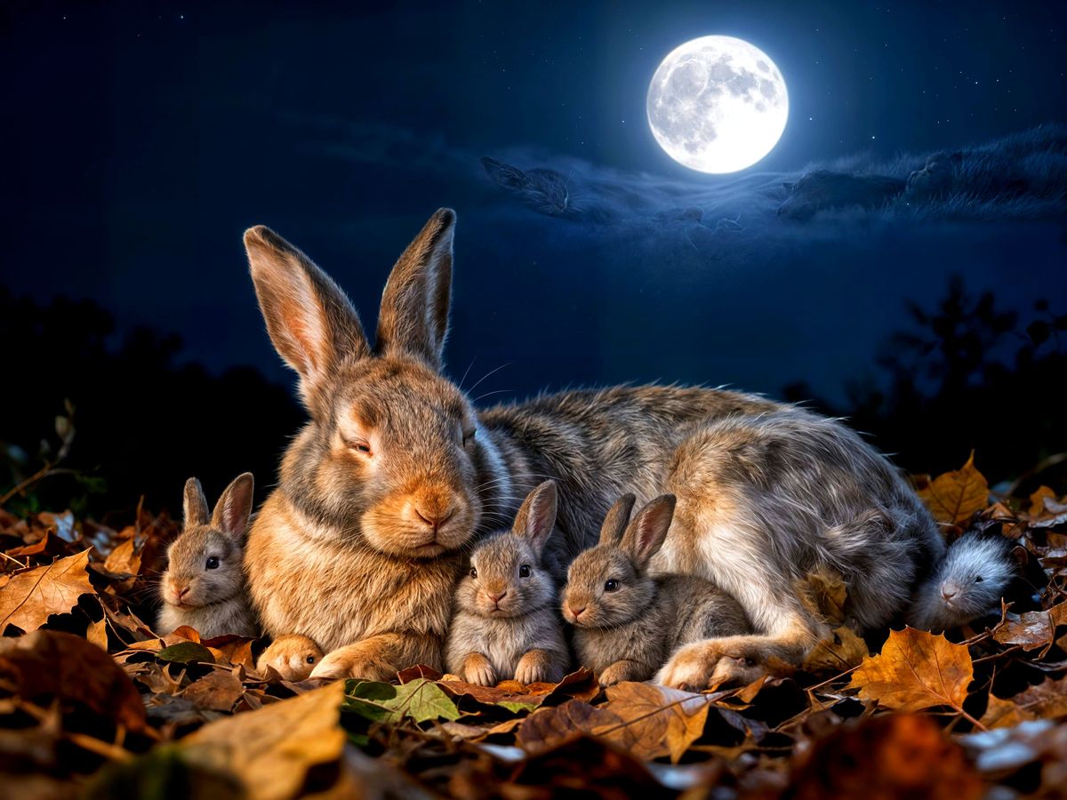 This image shows a highly detailed CGI of a mother rabbit sleeping with her baby bunnies nestled in leaves under the moonlight. It features a hyper-realistic and cinematic aesthetic with incredible detail.