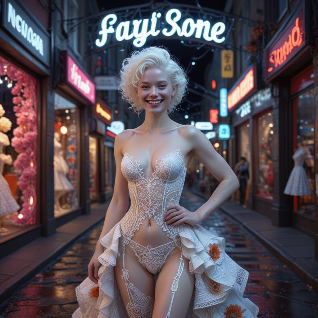 A hyperdetailed, 8K image of a smiling, flirtatious albino woman on a neon-lit street. She is shirtless, wearing intricate underwear and an elaborate gown, set against Escher-style architecture.