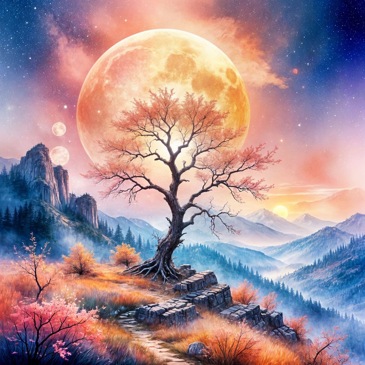 This ethereal watercolor painting depicts a serene night landscape with a large, glowing moon in pastel hues. A delicate, silhouetted tree stands against the luminous sky, with misty mountains in the background.