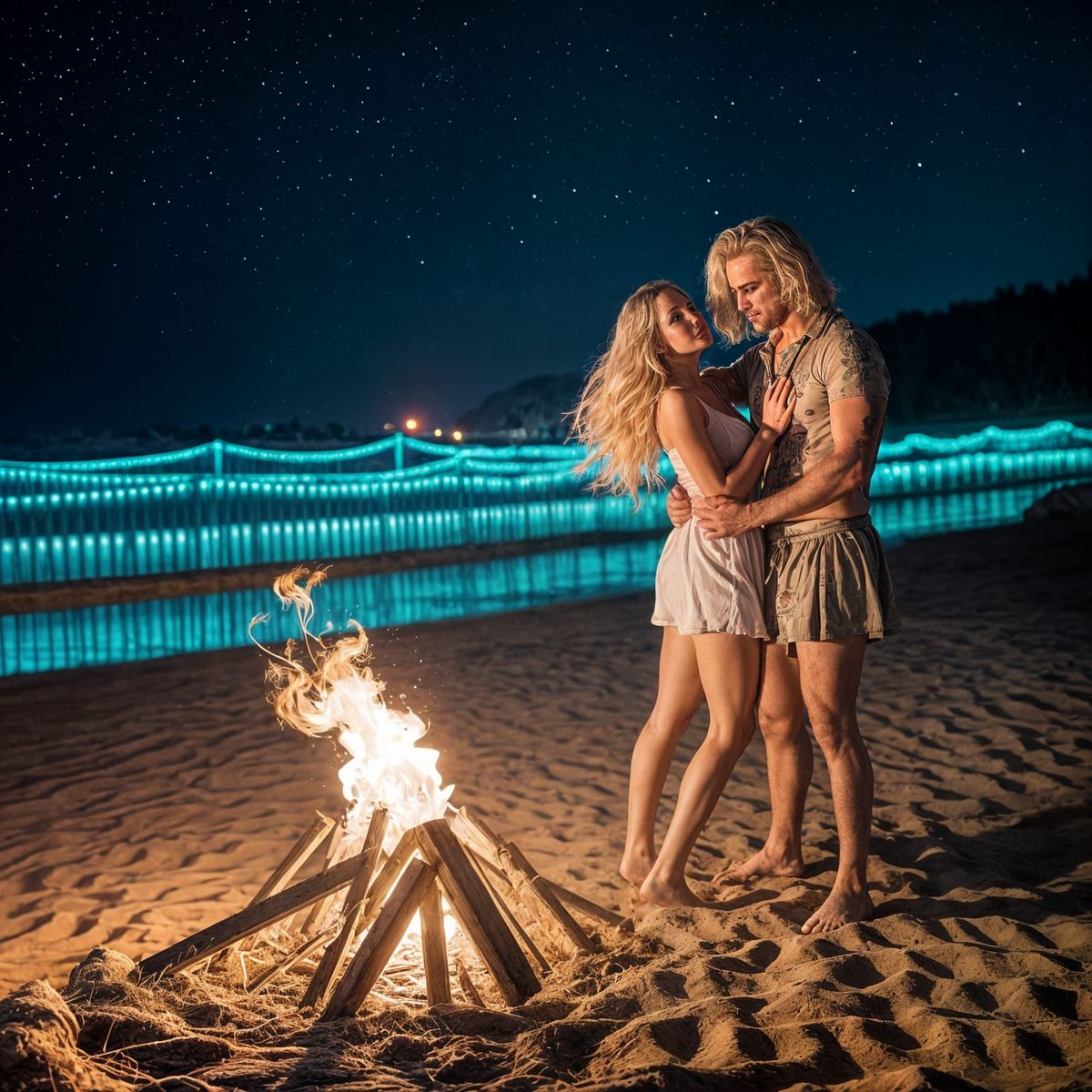 A vibrant beach scene at night with friends gathered around a bonfire. Bioluminescent waves wash the shore under a starry sky, with a couple embracing by the fire.
