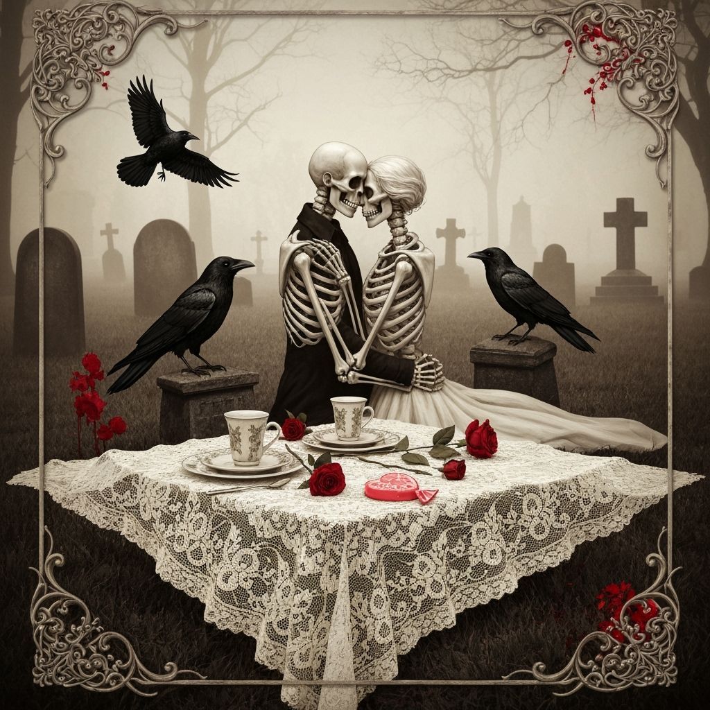 This sepia-toned image depicts a hauntingly beautiful graveyard picnic with a skeletal couple. A vintage tablecloth holds wilted roses and broken candy, with ravens nearby.