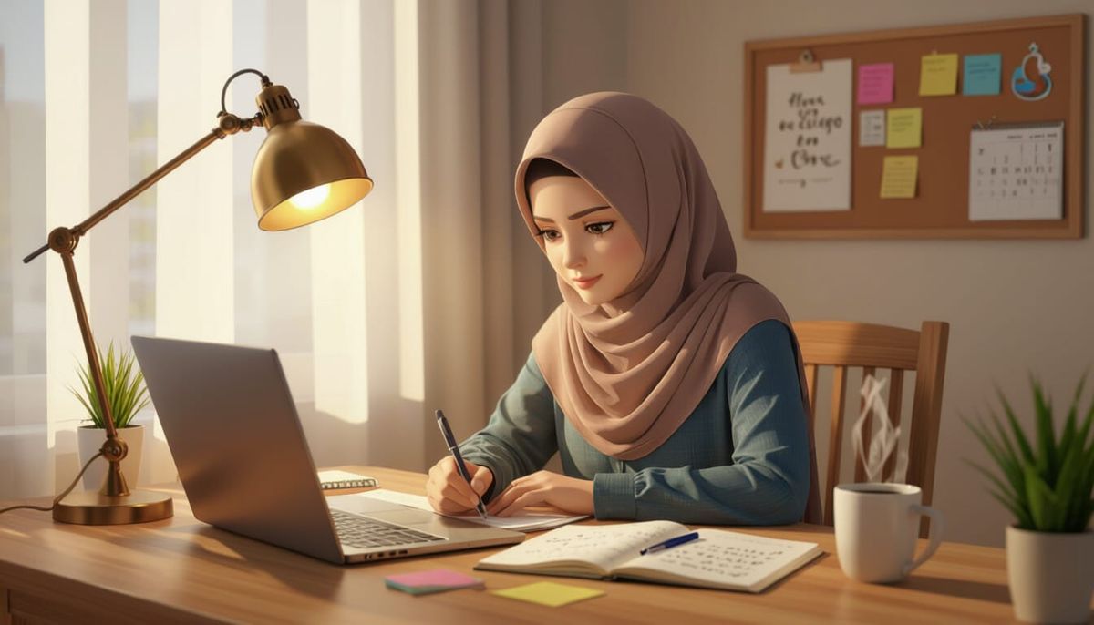 This image shows a Muslim girl studying in a cozy, organized room. Natural light and a warm desk lamp illuminate her workspace, filled with study materials and comforting items, rendered as highly detailed 3D anime art.