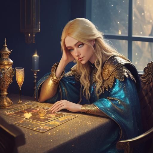 A close-up portrait of a blonde tarot reader with blue eyes at a table. The image is fantasy art with soft golden light, deep shadows, glitter, sparkles, and a phoenix.