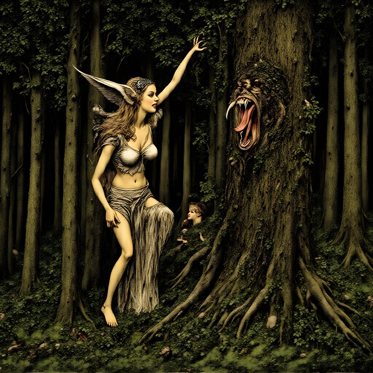 A haunting image of a screaming banshee in a forest setting. The artwork evokes the style of old masters, with surreal fantasy elements.
