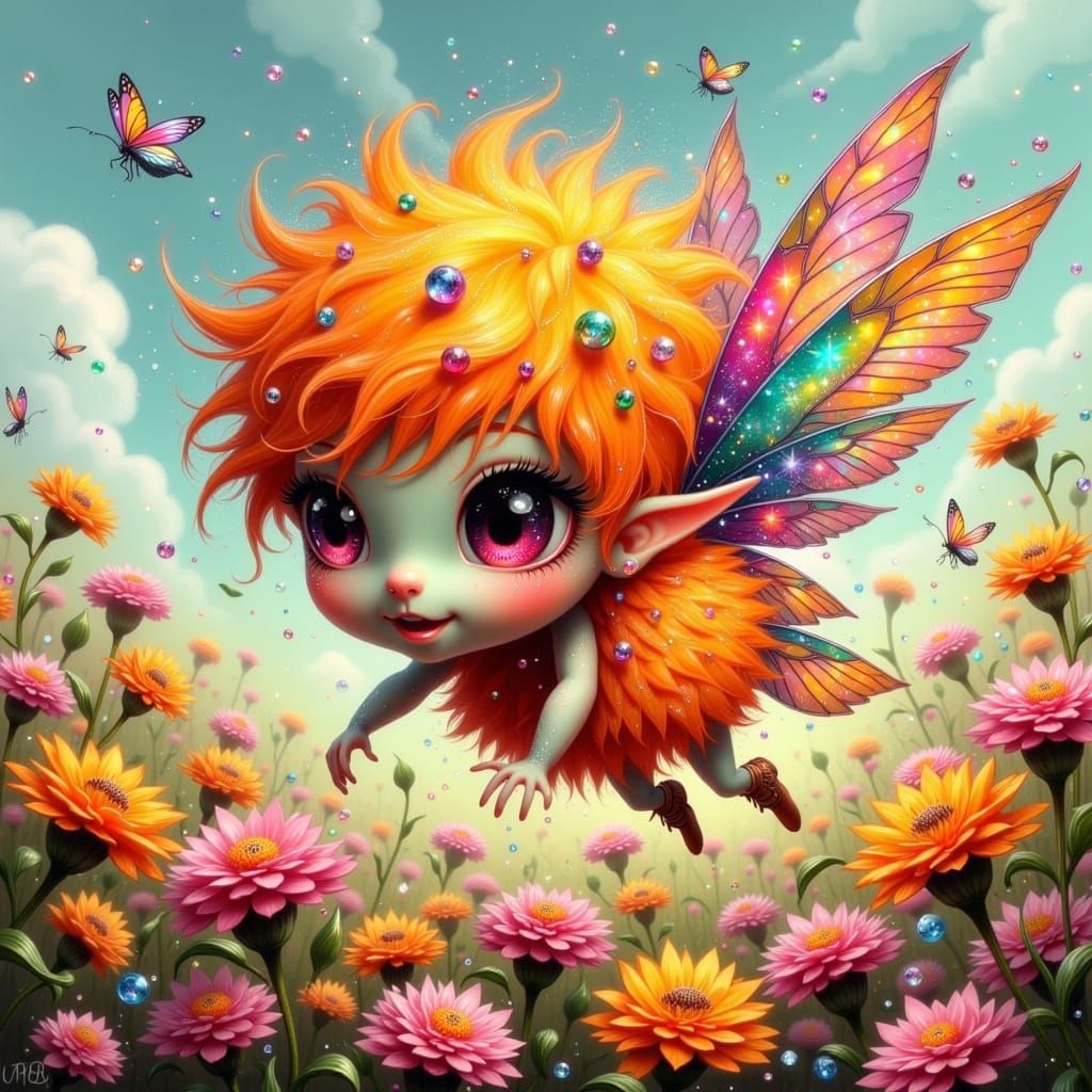 This vibrant illustration features a whimsical fairy punk creature with a crystalized body made of gemstones, surrounded by colorful zinnia flowers and a sun-drenched meadow field, in a style reminiscent of Hayao Miyazaki and Mexican folk art, with bold lines and textured details.