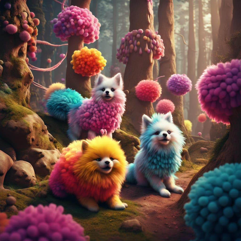 This image shows fluffy animals constructed from colorful pom poms joyfully jumping through a strange fantasy forest with twisted, gnarled trees. The image has a hyperrealistic, cinematic quality.