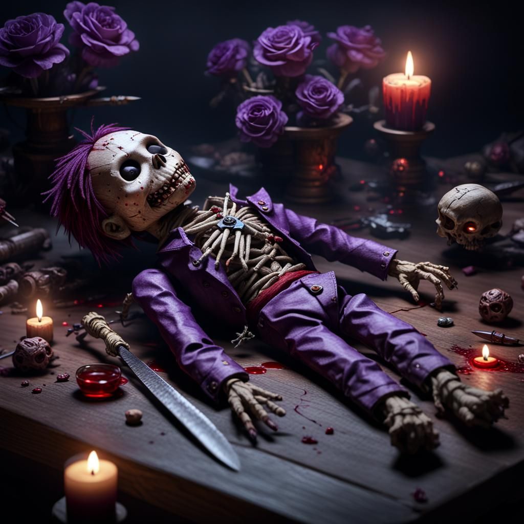 This image shows a voodoo doll lying on a table, pierced with needles and surrounded by blood. The scene is rendered as dark fantasy concept art with dynamic and volumetric lighting.
