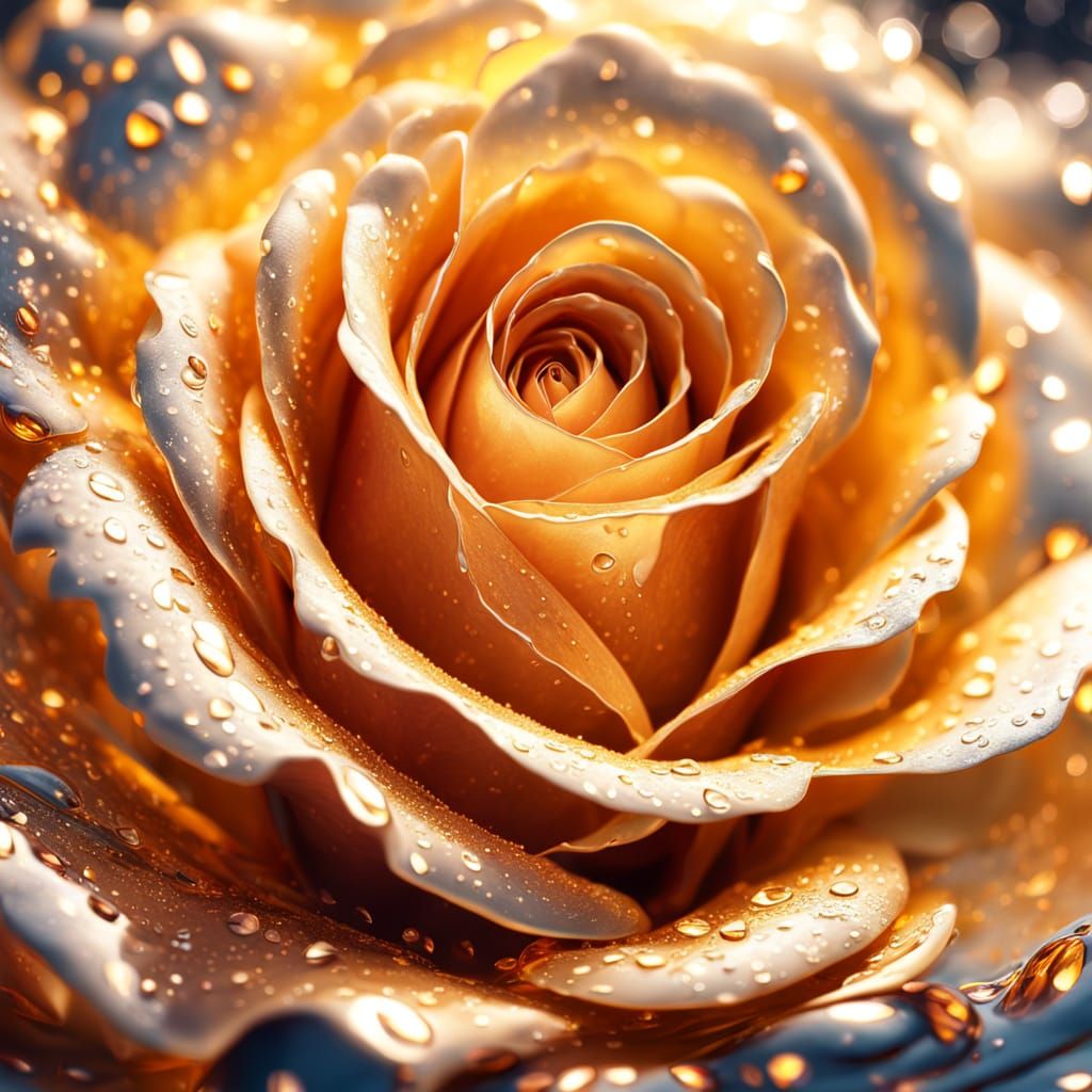 A macro photograph of a rose inside a shimmering teardrop. The digital art features delicate petals, a soft focus and warm golden lighting, rendered as elegant and serene.