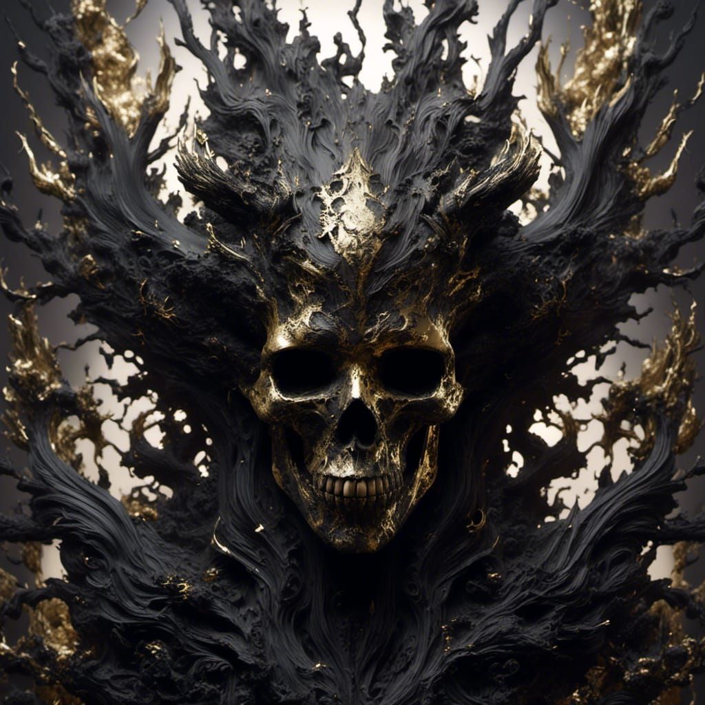 This image shows a full-bodied, elegant, and attractive black demon with golden kintsugi cracks and a black skull, rendered with realistic and intricate details in octane.