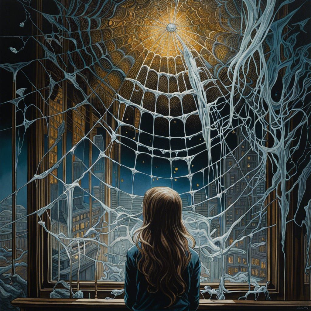 A detailed image of a girl observing an ornate, magical spiderweb. The artwork features fluid gouache and watercolor art with intricate details and natural, volumetric lighting.