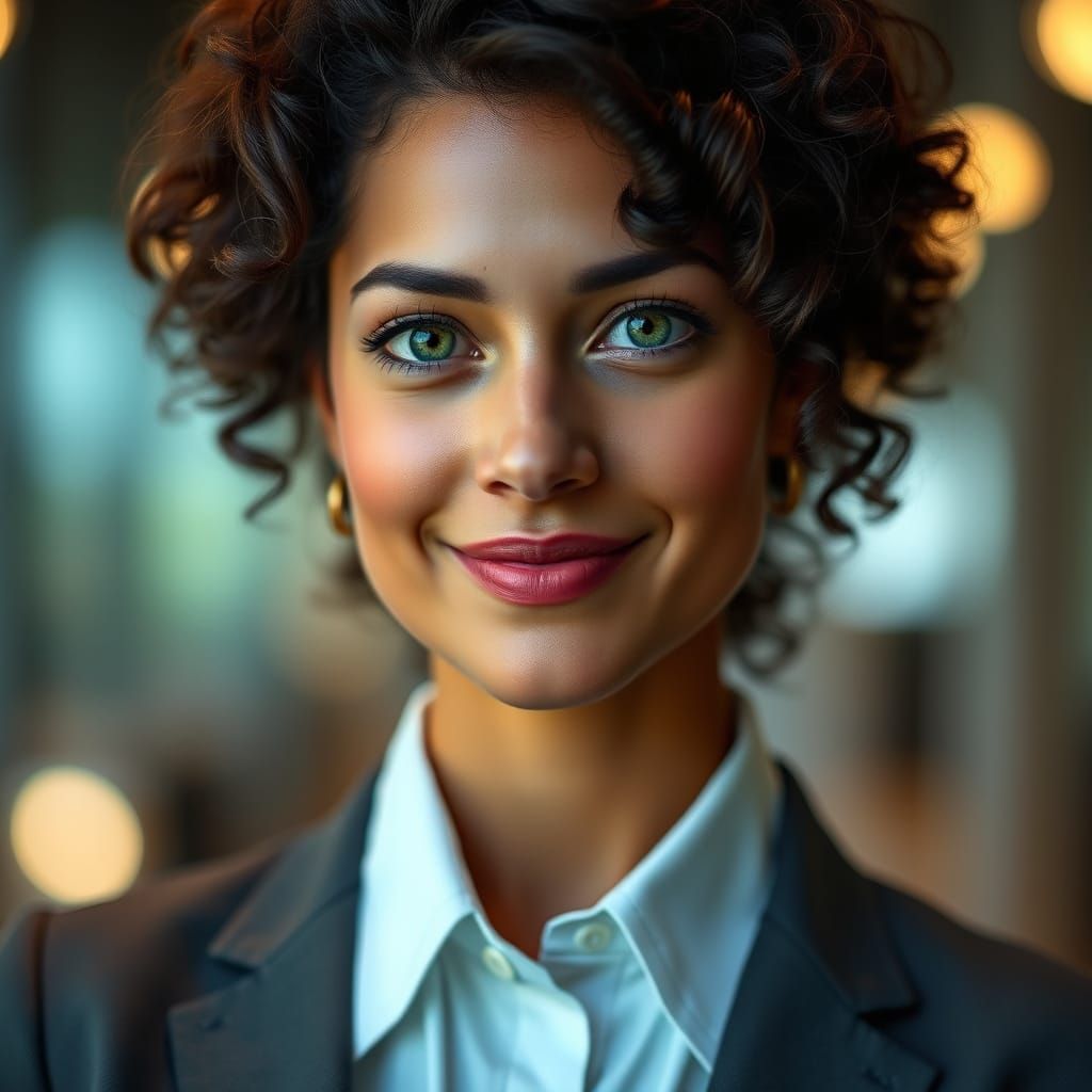 A captivating close-up portrait of a woman with curly hair and green eyes, presented in vibrant colors. The subject has a soft smile and is professionally dressed, set against a blurred background.