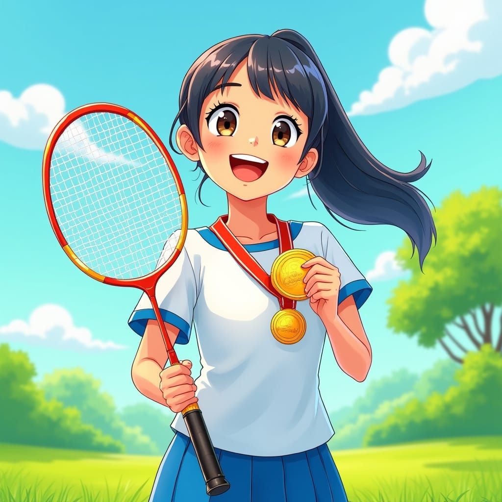 This vibrant illustration depicts a young schoolgirl holding a gold medal and badminton racket, surrounded by a colorful playground scene with lush green grass and fluffy white clouds. The artwork blends whimsical brushstrokes and textures reminiscent of classic children's book illustrations.