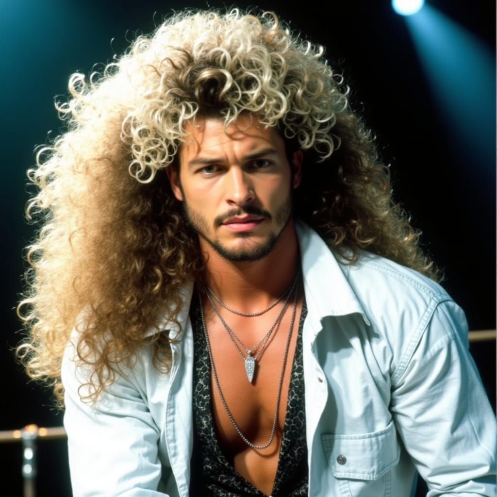 This image captures the essence of a charismatic eighties rockstar, with a stunning mullet hairstyle and a dash of retro glam. The subject sports a majestic mane of hair, perfectly captured with intricate details and a hint of Aquanet-fueled volume.