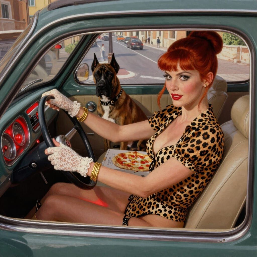 This image is a 1970s Italian gouache painting. It features a pin-up woman in a Fiat 500, with a dog and pizza box, bathed in red light.