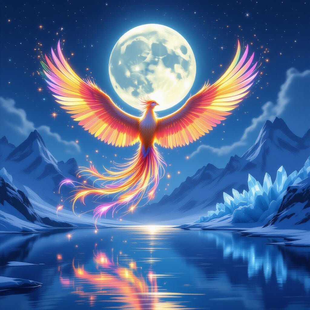 This image shows a celestial phoenix with rainbow feathers soaring in the night sky. The bird is illuminated by a full moon, with wings outstretched over a mirrored lake and icy mountains, in a dreamlike, fantasy aesthetic.