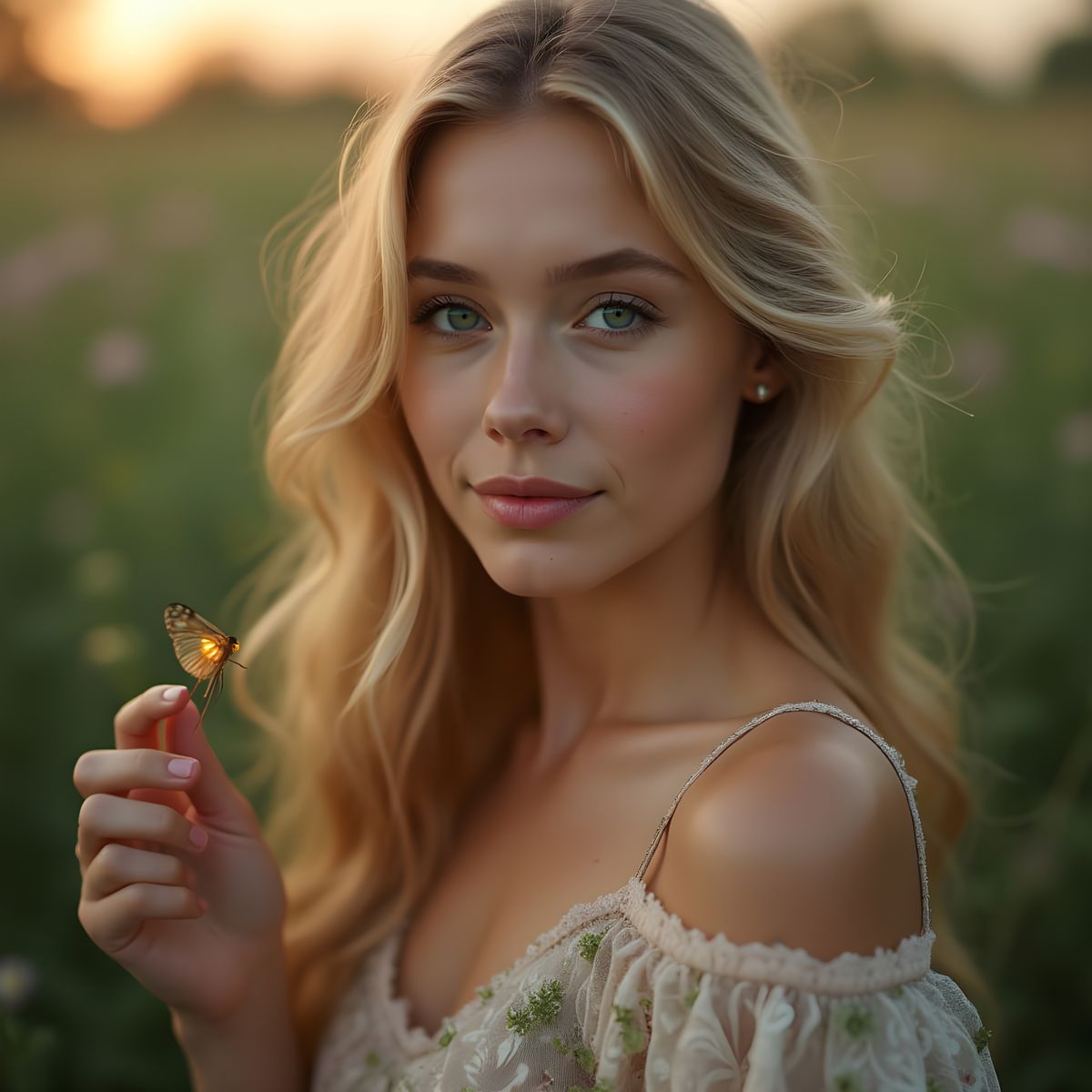 This stunning portrait features a young blonde woman with porcelain skin, emerald-green eyes, and golden hair, set against a warm and idyllic wildflower meadow backdrop, with a delicate dress and a magical firefly accent.