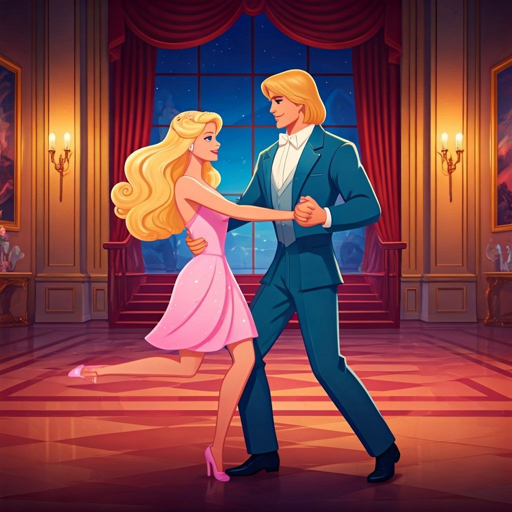 This image shows Barbie and Ken in elegant outfits dancing in a grand mansion with lavish furnishings. The vibrant 2D cartoon art style has bold lines, bright colors, and dynamic poses.