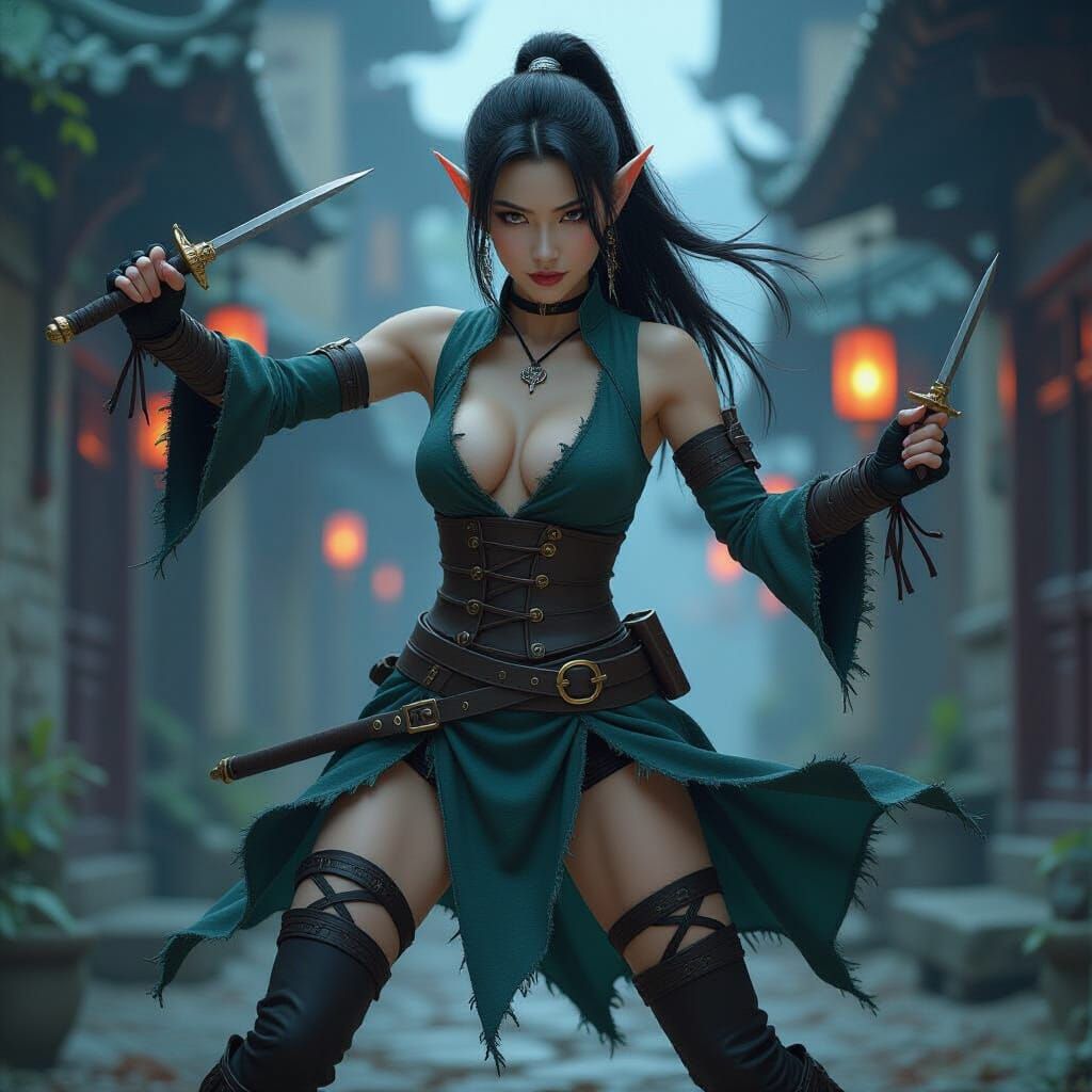This image shows a small Asian elf rogue in a dark fantasy setting. The elf is wearing tattered clothing and throwing knives acrobatically. The image is reminiscent of a cinematic film still with dramatic lighting.