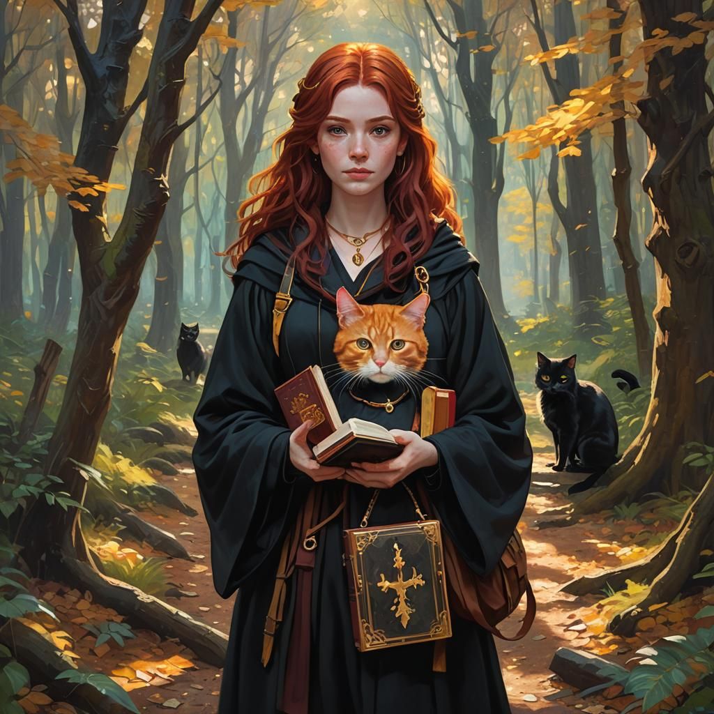 This image shows a dark-red-haired girl in black robes, carrying books, with two cats in a sunlit forest. Rendered as vibrant fantasy art with intricate brushstrokes, it captures a mystical atmosphere.