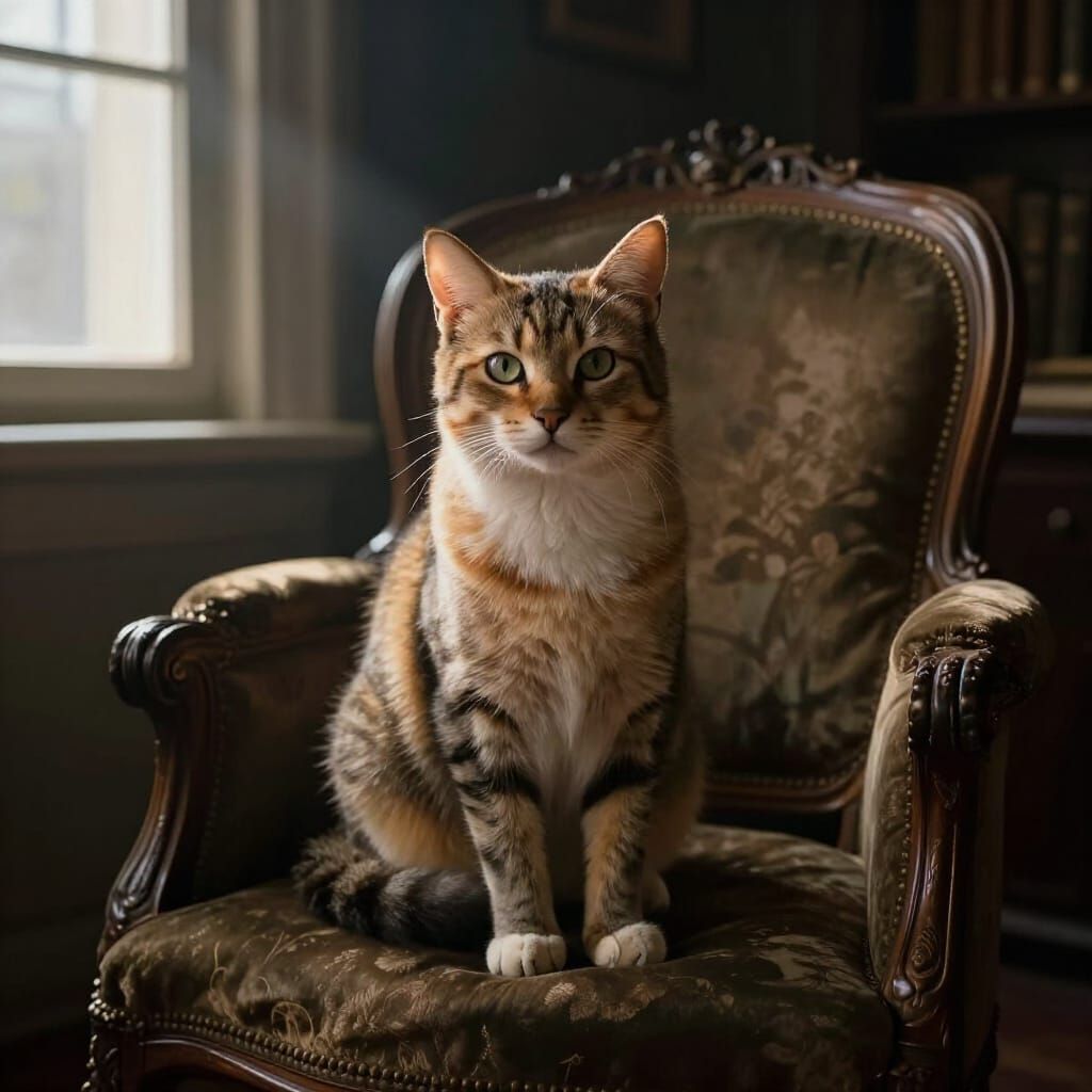 This image shows a wise and interesting pet, possibly a cat or fox, with intelligent eyes, seated on an antique armchair. Sunlight illuminates the scene, creating a painterly atmosphere with rich colors and chiaroscuro lighting, evoking quiet contemplation.