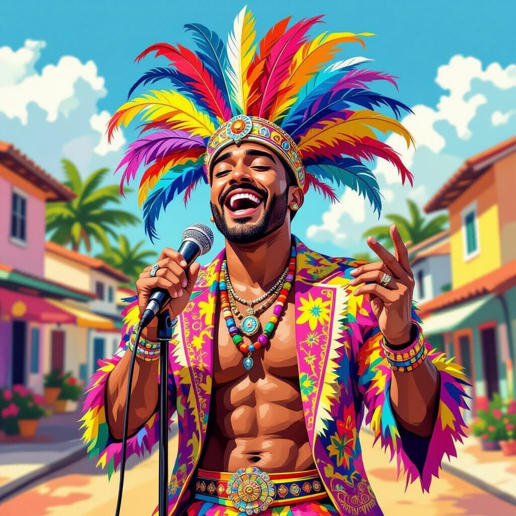 A vibrant image of a latino man in carnival attire singing into a microphone. The setting is a colorful Barbadian village, rendered in a Disney-esque comic style with bold lines and exaggerated features.
