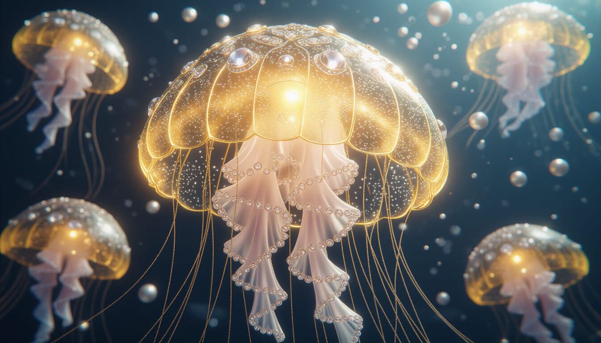 Design your own luxurious jellyfish with gold, diamonds, and pearls using our free and easy AI generator.