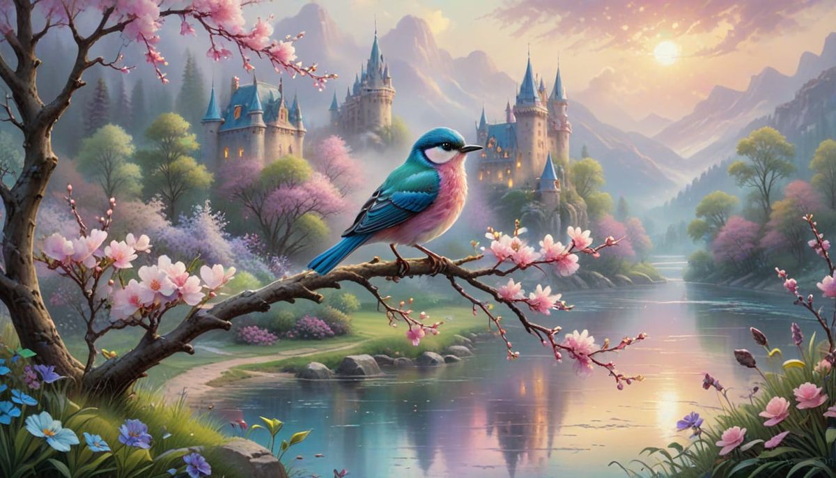 This detailed oil painting depicts a vibrant bird perched on a branch amidst soft pink blossoms, with a scenic landscape featuring a river, meadows, forest, and castle under sunshine.