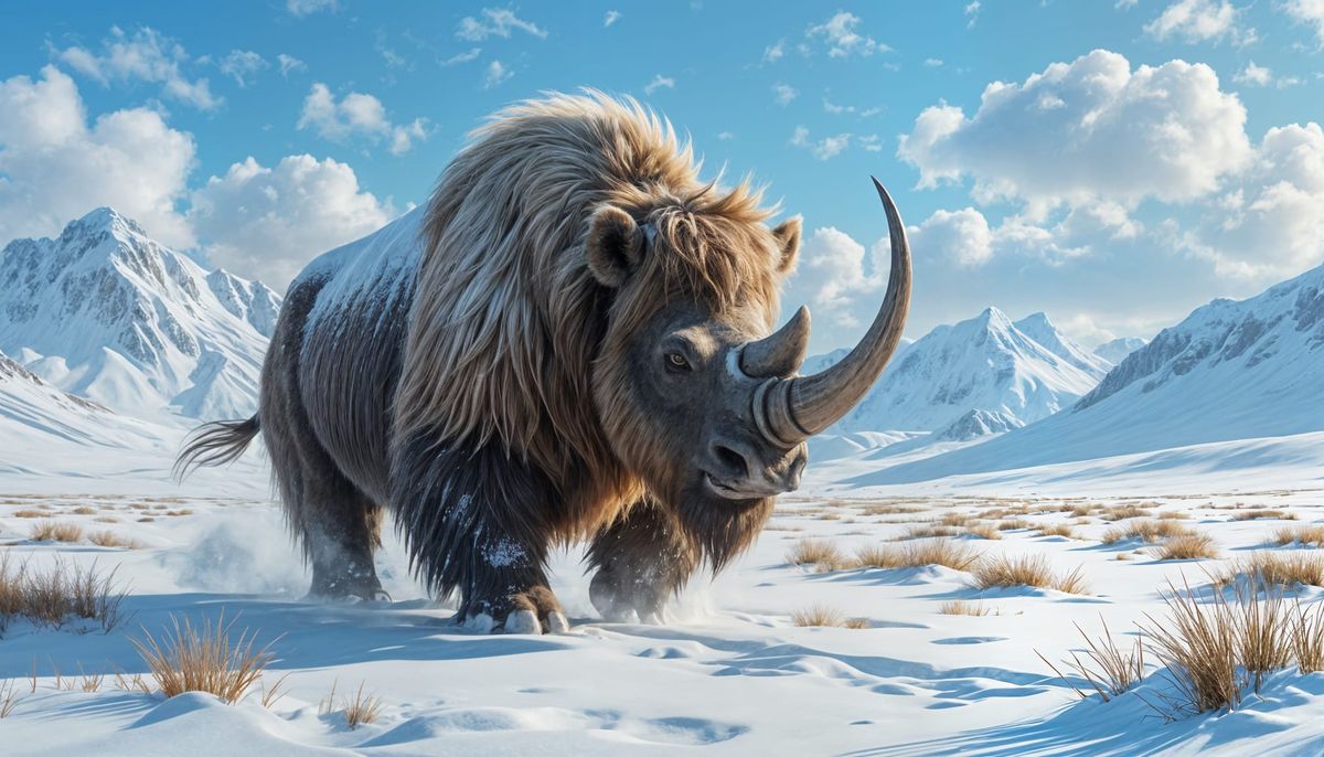 This image shows a woolly rhino traversing an icy, prehistoric landscape. The animal's thick fur and towering tusks are rendered with realistic textures, capturing a dynamic scene from the ice age.