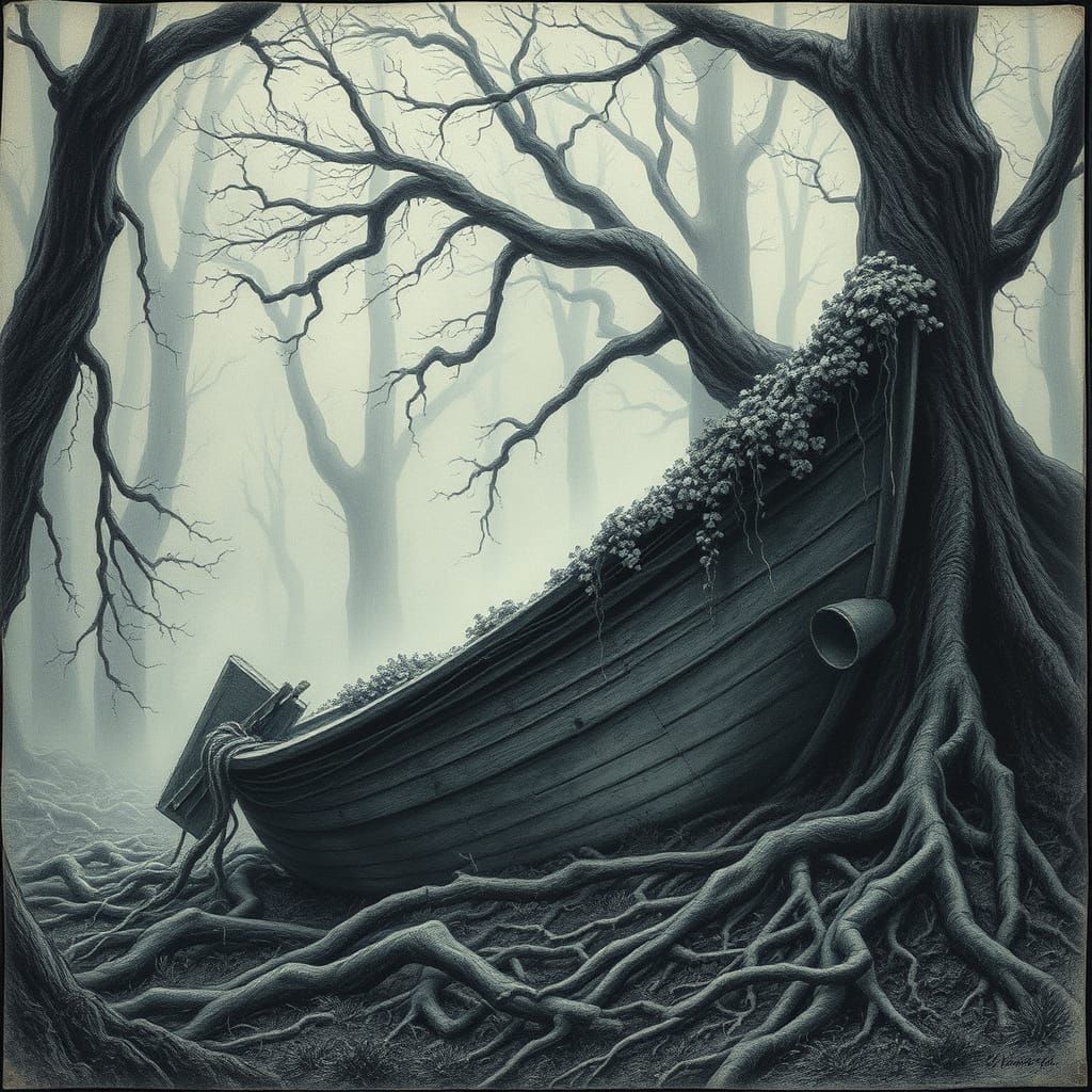 A haunting image of an old boat, now part of the forest. The scene evokes dark, gothic romanticism with dreamlike terror, creating an eerie, mystical atmosphere.