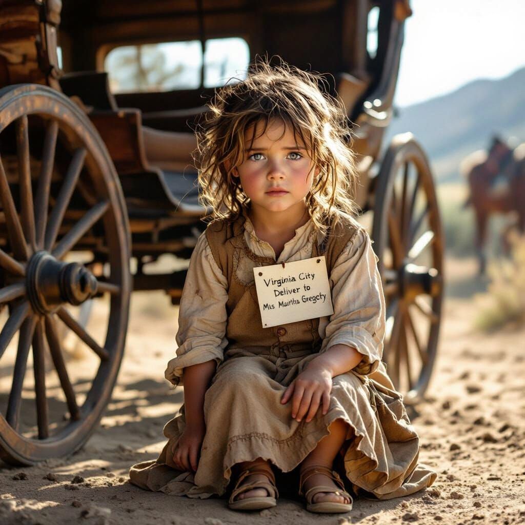 This hyperrealistic photo shows a scared, dirty little girl alone inside an 1800s stagecoach. She clutches a bag, with dramatic lighting and vintage lens effects.