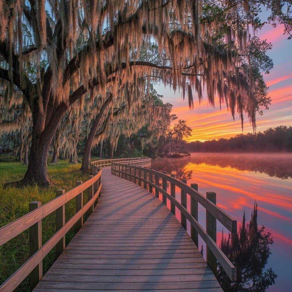 A scenic photograph of a wooden boardwalk winding along a serene lake at sunrise. The sky and water reflect vibrant orange, pink, and purple hues, enhanced by soft bokeh and natural lighting.