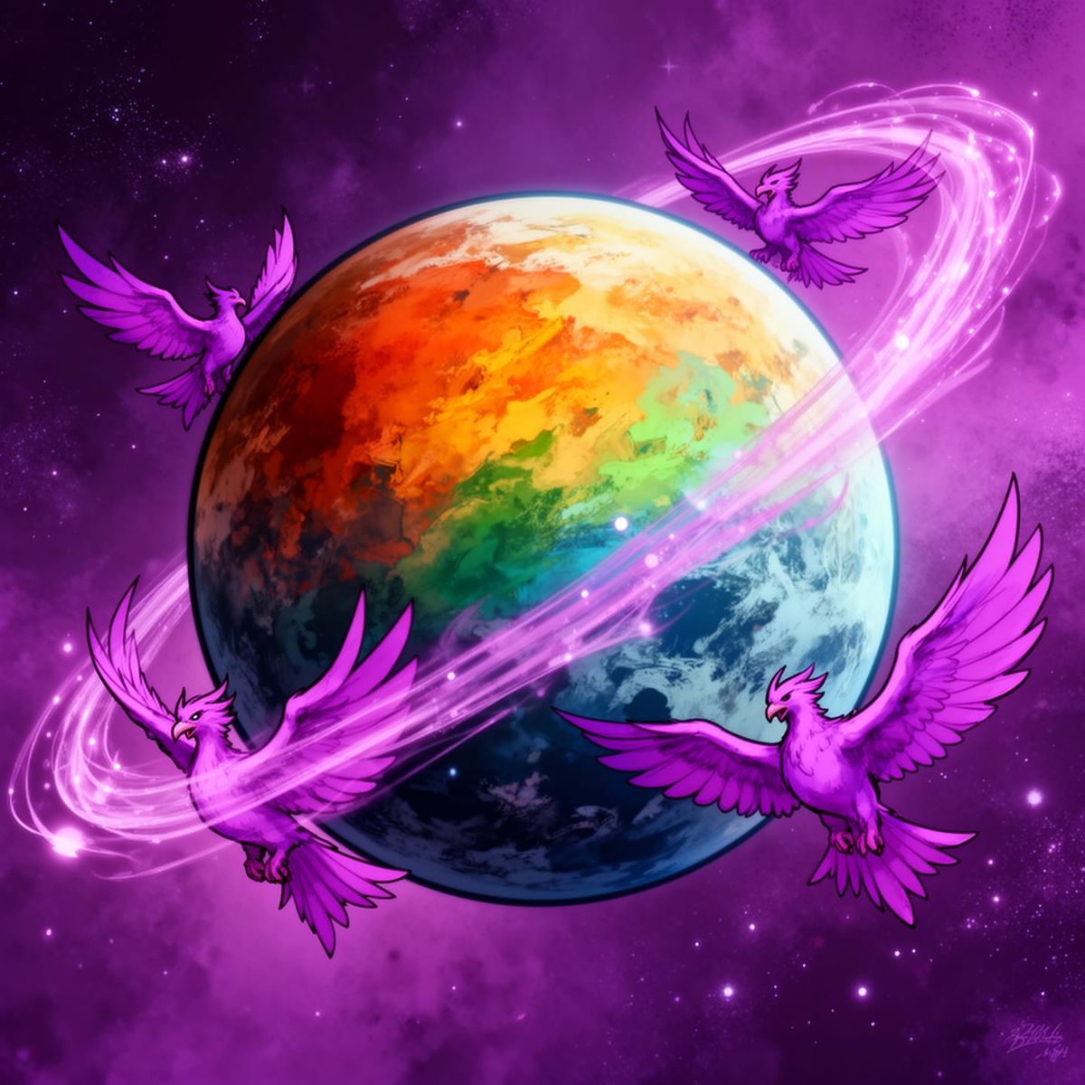 This image shows a massive, multi-colored planet encircled by two transparent, phoenix-shaped energy constructs. The scene is rendered in a comic book art style with dynamic lighting and saturated colors.