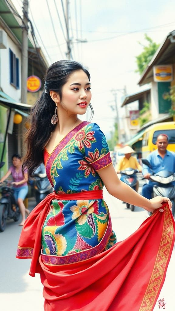 A beautiful young woman in a colorful mandala dress poses amidst the bustle of a Thai street, surrounded by lush greenery and historic architecture, captured in a stunning watercolor painting