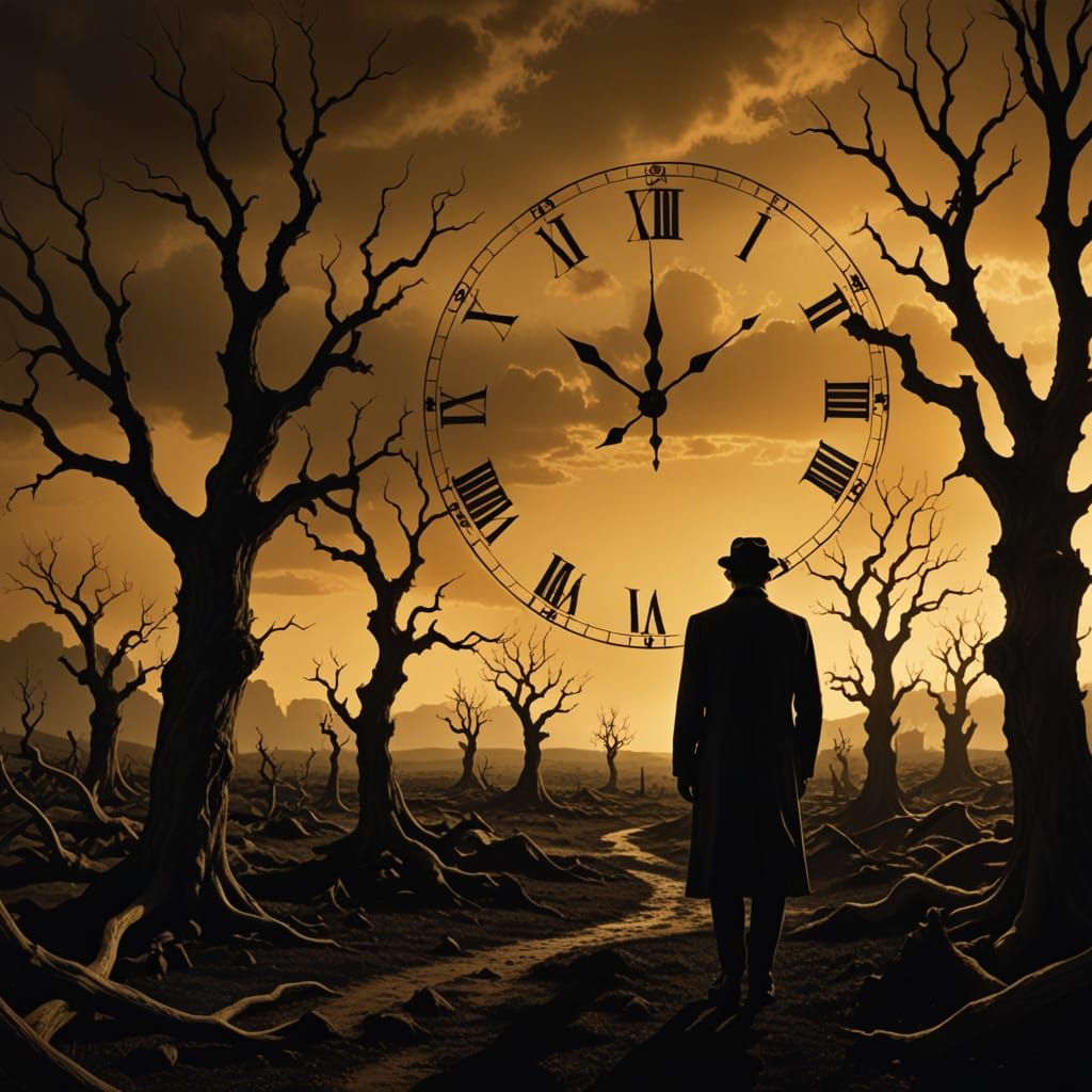 This image is a surreal, cinematic representation of a figure standing alone in a desolate landscape, surrounded by twisted, nightmarish trees and illuminated by warm golden light, creating an eerie and dreamlike atmosphere.