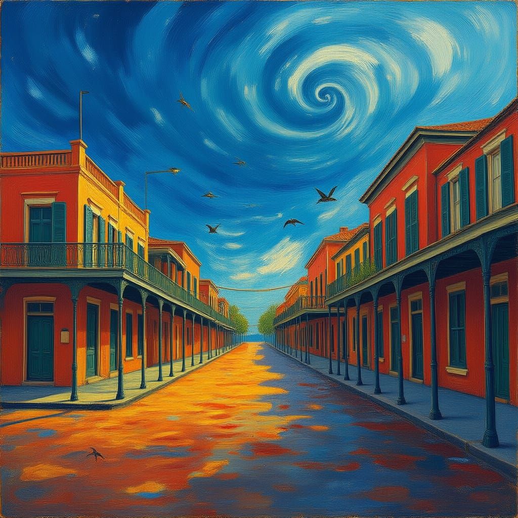 This painting depicts abandoned streets in New Orleans' French Quarter beneath dramatic, swirling hurricane clouds. Rendered with thick, textured paint layers in a vibrant, neo-impressionist style.