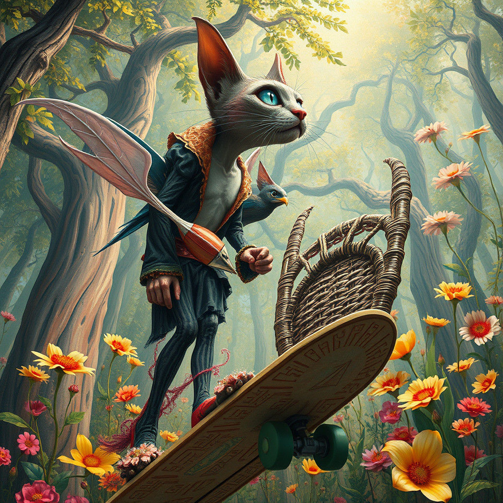 A surreal portrait of a woman-cat hybrid in a fantastical forest setting. This image blends art brut style with lithographic textures and iridescent patterns reminiscent of Klimt and Picasso.