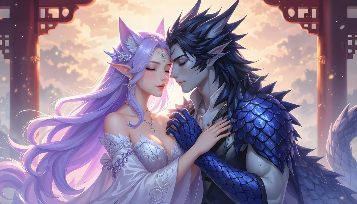 A hyper-realistic, high-definition image of a beautiful kitsune with lavender hair and a male dragon-human hybrid in a loving embrace. Features detailed scales and a soft glow.