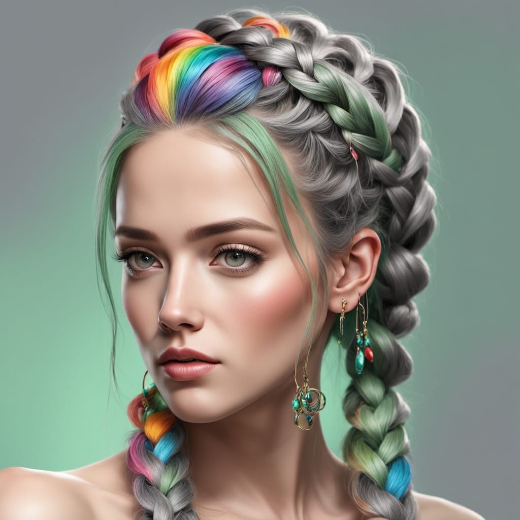 A close-up digital painting of a braided female figure looking over her shoulder. The figure features rainbow-colored hair, metallic accents, and intricate hair rings against a pastel background.
