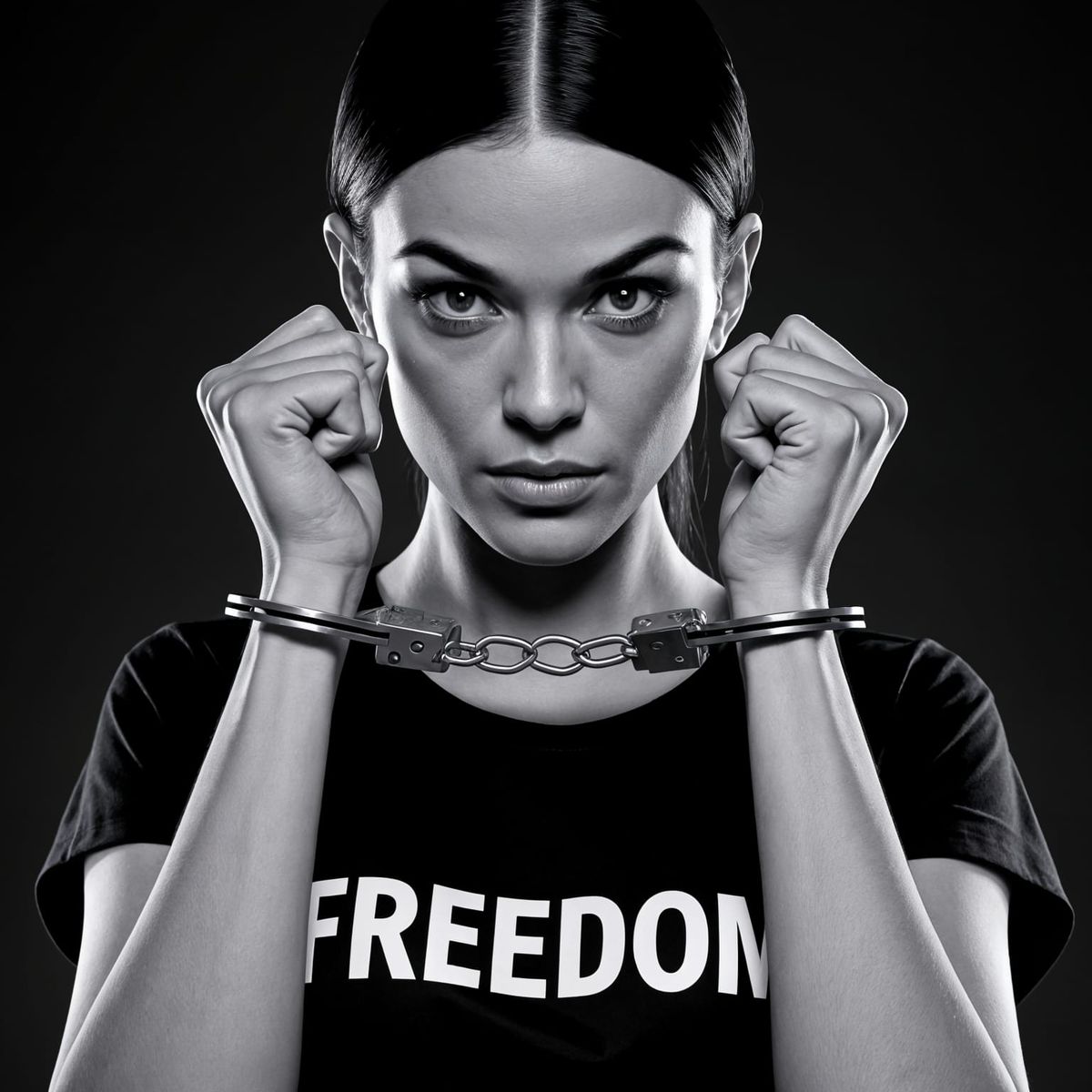 This striking image captures a young woman's powerful expression, proudly displaying handcuffs while wearing a 'Freedom' t-shirt in a dramatic black and white portrait with chiaroscuro lighting