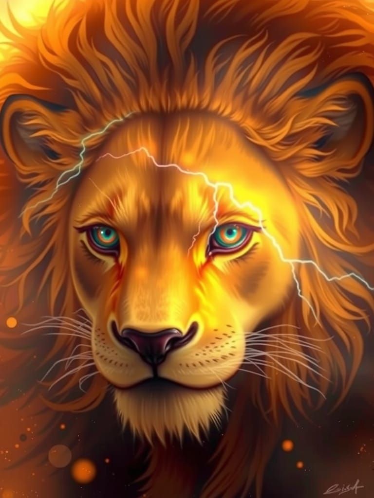 This image depicts a powerful lioness woman with a fiery mane and electric blue eyes, surrounded by a warm, mystical aura and vibrant colors, evoking a sense of wonder.