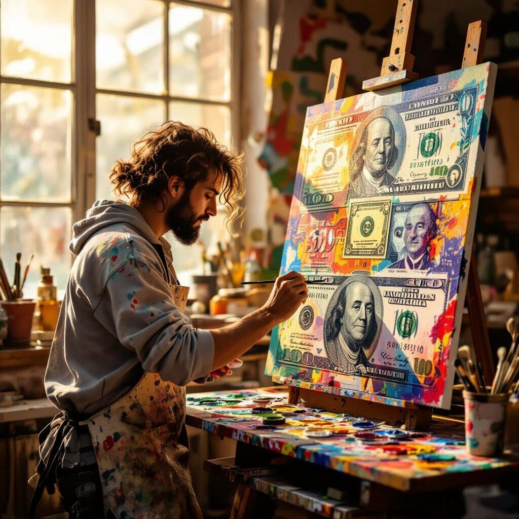 This image shows an artist creating currency art in a bright studio. The painting combines surreal and hyperreal styles, with dramatic lighting highlighting the detailed artwork and artist's focus.