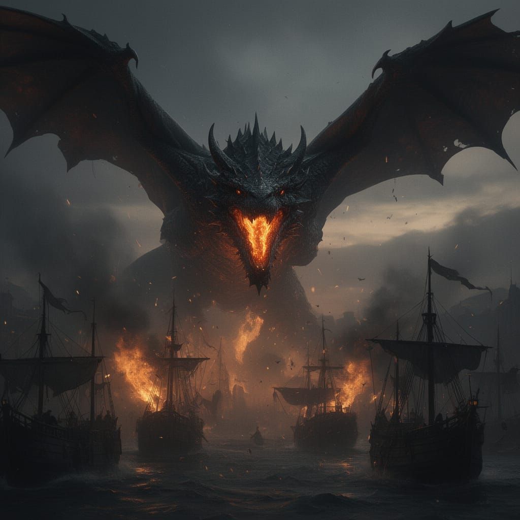 This image shows a massive dragon with leathery wings destroying ships with fire. The scene is dark and chaotic, with smoke, fire, and mist, in a gritty, realistic dark fantasy style.