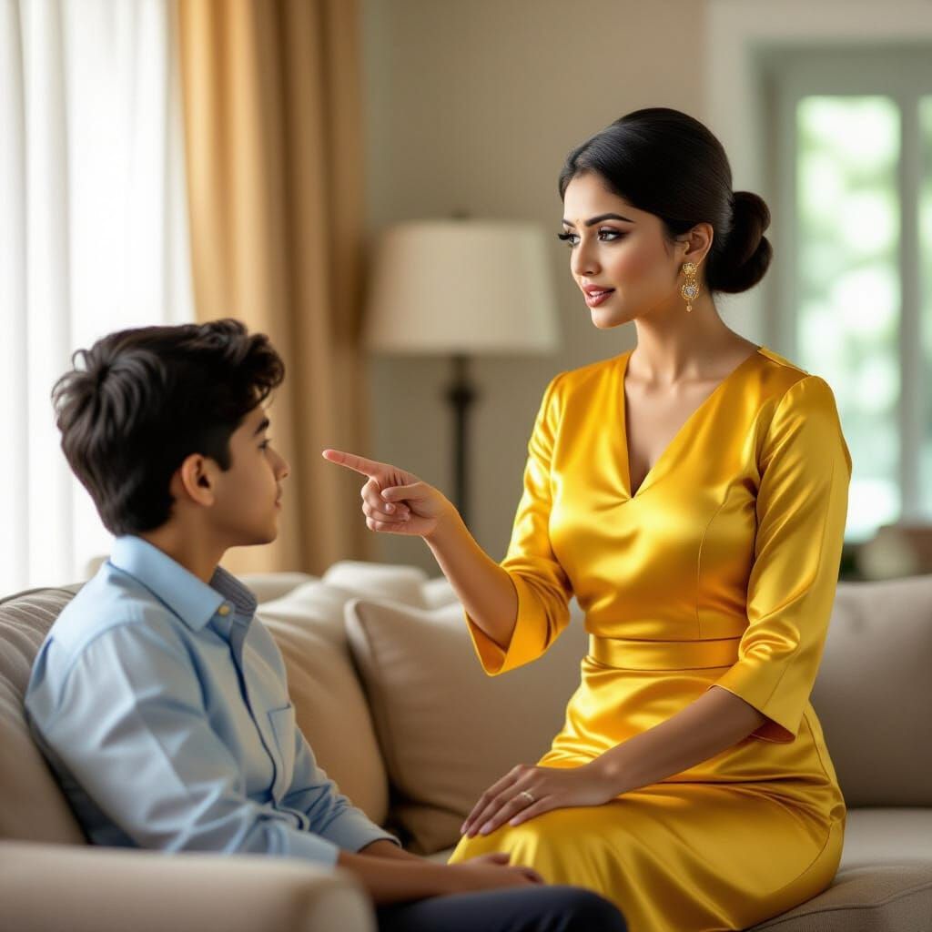 Generate unique images of Indian women in Western attire, like yellow tops and pencil skirts, next to sofas. Free and easy AI creation.