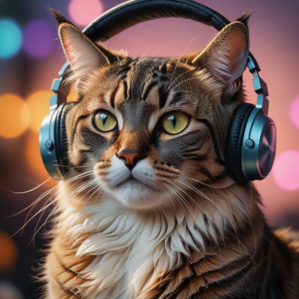 This serene feline portrait features a cat wearing headphones, surrounded by soft, warm lighting and calming pastel colors, creating a peaceful atmosphere that invites relaxation.